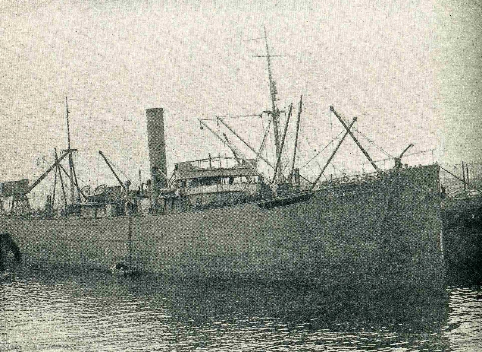 Bahia Blanca1918 A cargo ship. Per 1 [Prince Line, Celtic Prince (1)], 2 (image Celtic Prince, 5th image down), 3 [Hansa Line, Schönfels (2)], 4 [Hamburg South American Line, Bahia Blanca (2)], 5 (extensive data page in German, many images), 6 (German data with image 50% down), 7 (data re sinking, with map & internment data), 8 (Wednesday, 10 January), 9 (Miramar, link, you now must be registered to access). 449 ft. 6 in (141.61 metres) long, speed of 11 or 12 knots. Built for 'Prince Line Ltd. of Newcastle, (owned by Furness, Withy). Sister to Gaelic Prince. The vessel went aground at Île Saint-Barnabé, (Rimouski, St. Lawrence River, Canada), in Jul. 1918. Sold in 1926 to 'DDG Hansa' (Hansa Line - Deutsche Dampfschifffahrts-Gesellschaft "Hansa"), of Bremen, Germany & renamed Schönfels. Sold in 1938 to 'Hamburg-Sudamerikanische Dampfschifffahrts-Gesellschaft' (Hamburg South American Line) & renamed Bahia Blanca. On Sep. 11, 1939, vessel arrived at Rio de Janiero disguised as a Greek ship. On Jan. 9, 1940, trying to avoid the British blockade of Germany, & while en route from Rio De Janiero to Germany with a mixed cargo which included iron ore, tobacco & coffee, vessel hit an iceberg in the Denmark Strait (between Greenland & Iceland) & suffered extensive damage. 2 days later, on Jan. 11, 1940, the British light cruiser Newcastle sank the vessel with gunfire. At 66.09N/26.20W. I read that the crew of 62 reached Reykjavik, Iceland, aboard Hafstein (or maybe Hafsteinn), an Icelandic trawler, & there awaited repatriation to Germany. On May 10, 1940, Iceland was occupied by the Allies. The crew were arrested & transferred to internment camps in Great Britain & later in Canada. Anything to add?