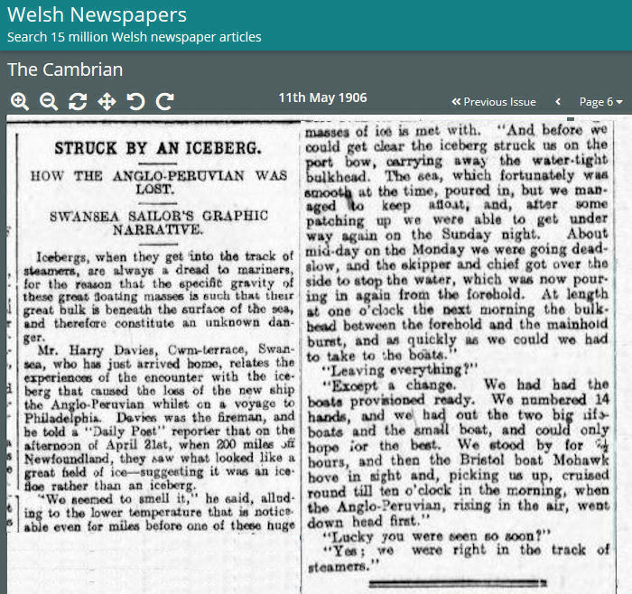 Chepstow Castle1913 A cargo ship. Per 1 (Union Castle Line history), 2 (Anglo-Brazilian image), 4 (Union-Castle), 5 (Miramar, link, you now must be registered to access). 425 ft. 6 in. (about 130 or so metres) long, speed of 12 knots. Built for 'Nitrate Producers' Steamship Co., Ltd.', (Anglo Line), Lawther, Latta & Co. Ltd. of London, managers. Presumably for the South American nitrate trade. Involved in an accident perhaps in 1914? Sold in 1915 to Union-Castle Mail Steamship Co. 'to augment ships requisitioned for war service' & renamed Chepstow Castle. In 1927, the first ship to berth at newly built port at Walvis Bay (Namibia, I believe). On Apl. 7, 1932, was wrecked at Toward Point, Rothesay Bay, & on May 10, 1932 arrived at Port Glasgow (both Scotland) to be broken up. Two of the above links say, however, broken up only in 1933. Anything to add?