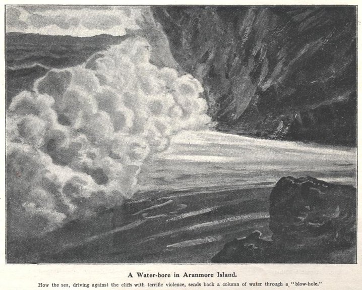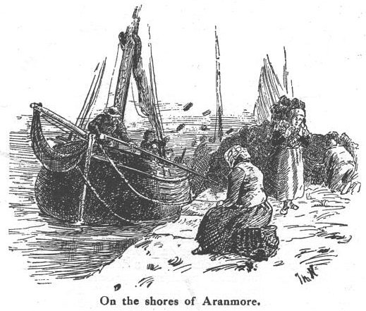 The vessel - now replaced by a fine boat the " Dun Angus" - was in the last state of decay. However, despite various discomforts, the three hours' passage soon passed. On the voyage I made the acquaintance of the commander, Captain Meehan, a fine sailor of the old school. With him I swapped yarns, which spread from one end of the globe to the other, but mostly centred on Callao and San Francisco in the " wicked old days " of the " windjammer.The mountains of Clare appeared first, then I perceived the islands. Inishmeer drew near, and its beach and old castle soon were plainly visible.