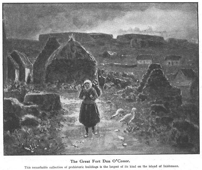 There is a magnificent and ever-changing view from the village, but a better one still can be obtained from the great fort Dun O'Conor. This fort is supposed to have been built two or three thousand years ago, but it is not known by whom. There are the remains of several smaller ones on the island.