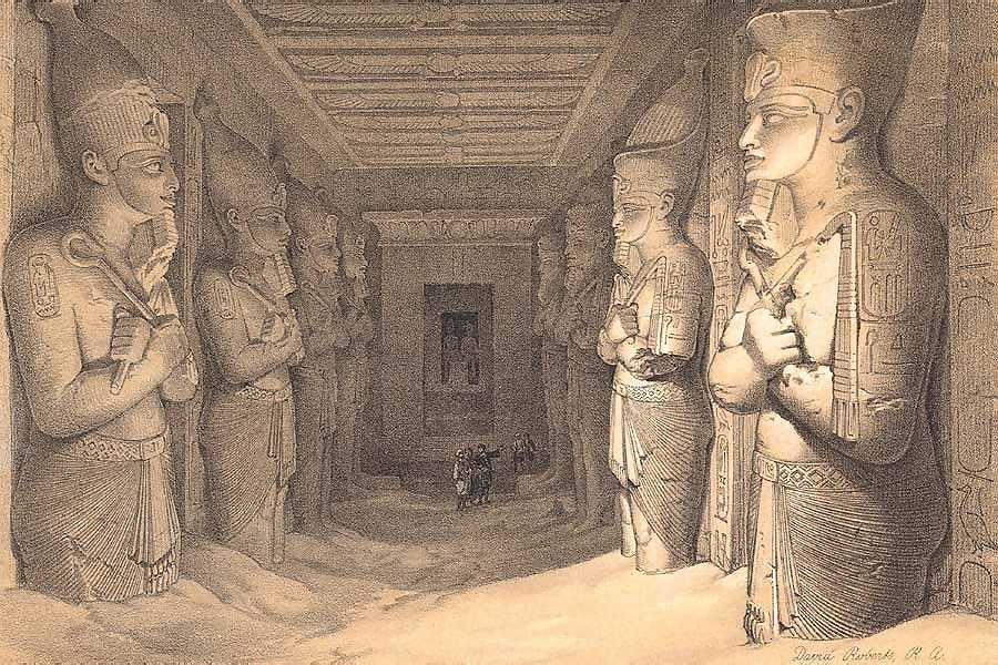 These two temples are some of the most remarkable achievements of the ancient world, only slightly less impressive than the Great Pyramid of Khufu. They were first seen by modern Western eyes in 1813, when the Swiss traveller Jean Louis Burckhardt noted them, and first partially cleared in 1817 by Belzoni, who was the first modern Egyptologist to enter the temples. The temples were visited by other early Egyptologists such as Champollion, Lepsuis, and Rossilline; in 1910, the Italian engineer Barsanti succeeded in clearing the sand completely away from the facade of the Great Temple. A steady trickle of visitors continued to make the journey into Nubia to see the temples, but it was not until the UNESCO Salvage Campaign that the temples became one of the most popular sites for travelers to Egypt. In the book stores in Egypt you will find my most recent book on the site called, "The Mysteries of Abu Simbel: The Temples of the Rising Sun".And next another painting, of the main interior passage of the Great Temple, by David Roberts, R.A. (1796-1864). I was interested to read that the artist, who also painted the Dome of the Rock in Jerusalem, was permitted to do so only after ridding his brushes of hogs' hairs.
