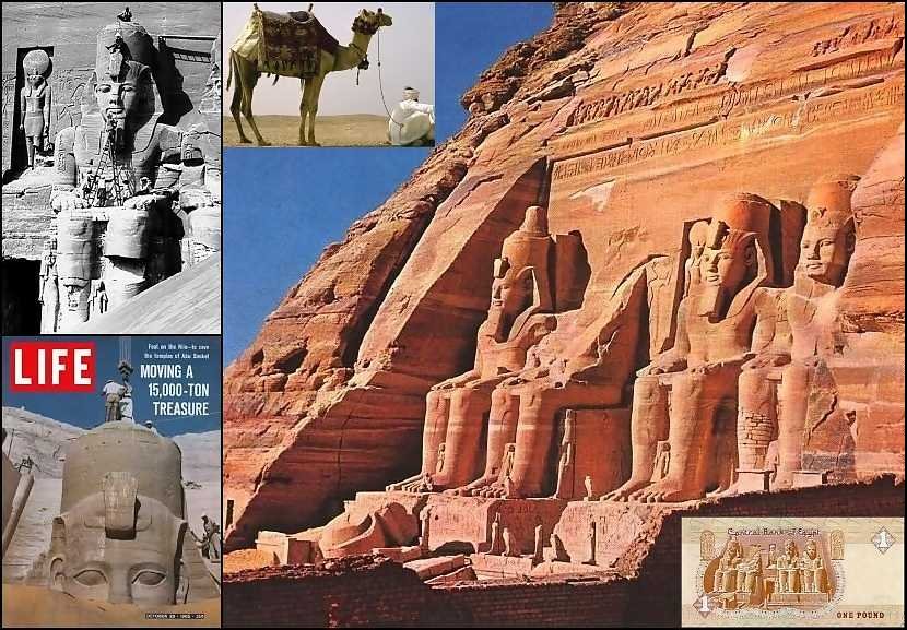 But first on this page another composite image that I hope you will enjoy. At top left is another image taken on an expedition conducted in the early 1900s by the Oriental Institute of the University of Chicago. This 1906 image is, of course, of the head of Ramesses II. It shows Dr. James Henry Breasted, along with his wife Frances & son Charles measuring the statue. I am sure that the image is still somewhere on the University of Chicago site. But I cannot locate it in 2009, as this site must move to a new location. Beneath that is the cover of the Oct. 23, 1965 issue of 'Life Magazine' which contained, I understand, an article about the Temple relocation project. The main image is of the Great Temple as it was before the 'move', from an old issue of 'Horizon' magazine, I understand. And last, but not least, a couple of small images ~ the Temple depicted on an Egyptian 1 pound bank note & a camel. How's that for variety!