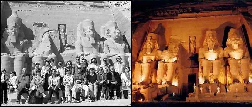 And below, a composite image which could be termed "Day and Night". On the left (below) a fine image of a Spanish tour group, from Valencia, I believe, at the main temple. I trust nobody will object to my using the image here. And on the right a night image taken, I presume, during a "Sound and Light" performance. As I see the group image, & in particular the gentleman in Arab dress in the back row, I am reminded of the fancy dress evening on our boat trip on the Nile. I was persuaded to dress in a similar costume which we purchased in the market at Esna. Let us just say that I did not look as good as an Arab Sheik as did Peter O'Toole in 'Lawrence of Arabia'! But our Spanish friend does look good. Ole!