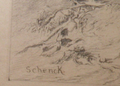 As I revisited this work, in early Jan. 2019, a print of it was available via e-Bay. Now long gone of course. Offered, by vendor 'jjwgcollectibles' of Florida for U.S. $98.84, a Christmas special at $30.00 less that its usual offering price of U.S. $128.84. Do drop by the item with its many images & the vendor's large store. Next is an image of the offered print, which print the vendor describes as being - 'Antique Print by Albrecht Schenck - Shepard Sheep in storm Pencil Signed? 16 x 21" Framed Ready to hang.' The work is signed at bottom left & that portion of the work can be seen here.