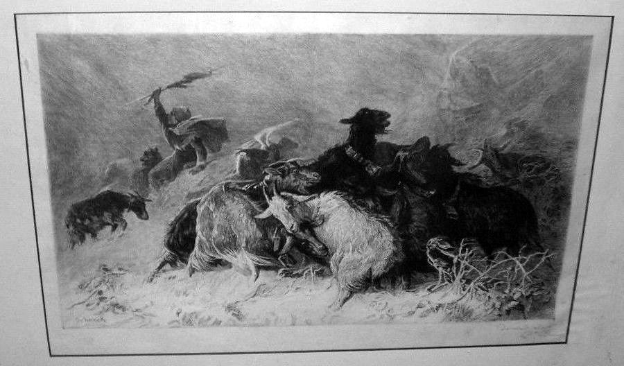 In Jul. 2022, a print of the work is available via Delcampe - here - entitled as follows:- 'TROUPEAU DE CHÉVRES EN DÉTRESSE tableau de M. Schenck.' At what would seem to be a modest price. I note that this print seems not to bear the artist's signature. The vendor dates the work as 1870, which date seems likely to be in error - see the text above.