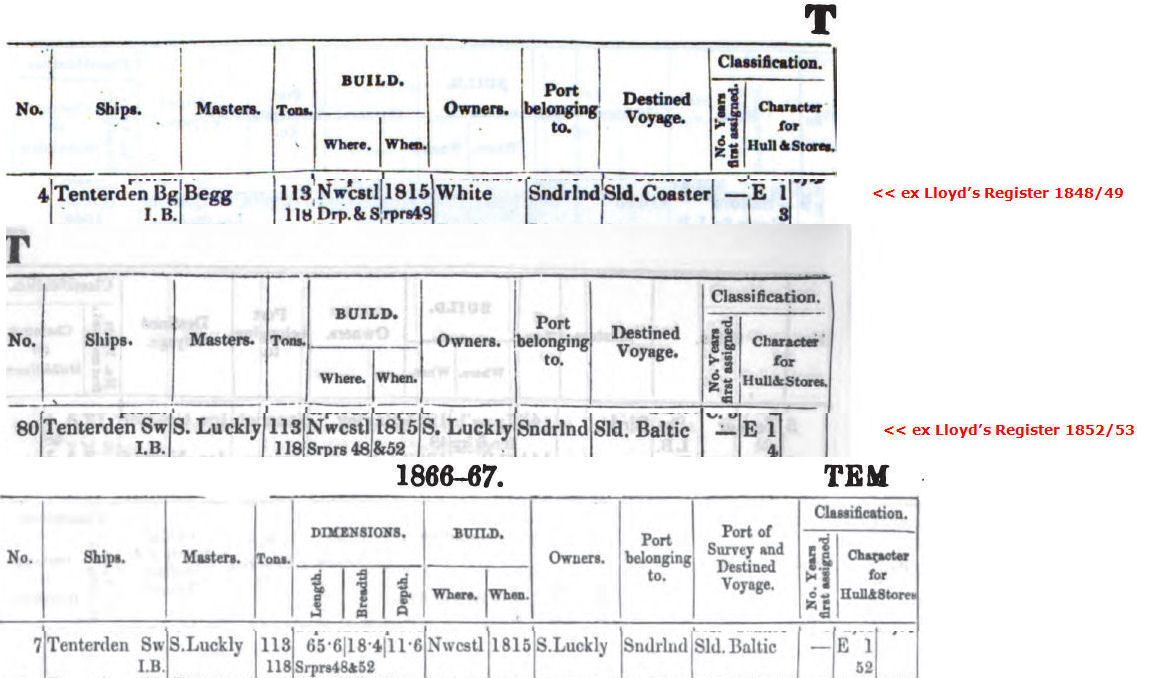 Keith Robertson has kindly drawn to my attention the details of the Tenterden rescue as set out in contemporary newspapers, available here on the website of the South Shields Volunteer Life Brigade. It would seem that the vessel was got off a couple of weeks later & was towed around to Sunderland. It now seems 100% certain that the Tenterden in question was built at Newcastle in 1815. ON 2681. It is referenced in Turnbull's Register of 1856 & also in Christie's Shipping Register of 1858 - then owned by William Adamson of Sunderland. Rather than S. Luckly of Sunderland, as recorded in Lloyd's Registers.