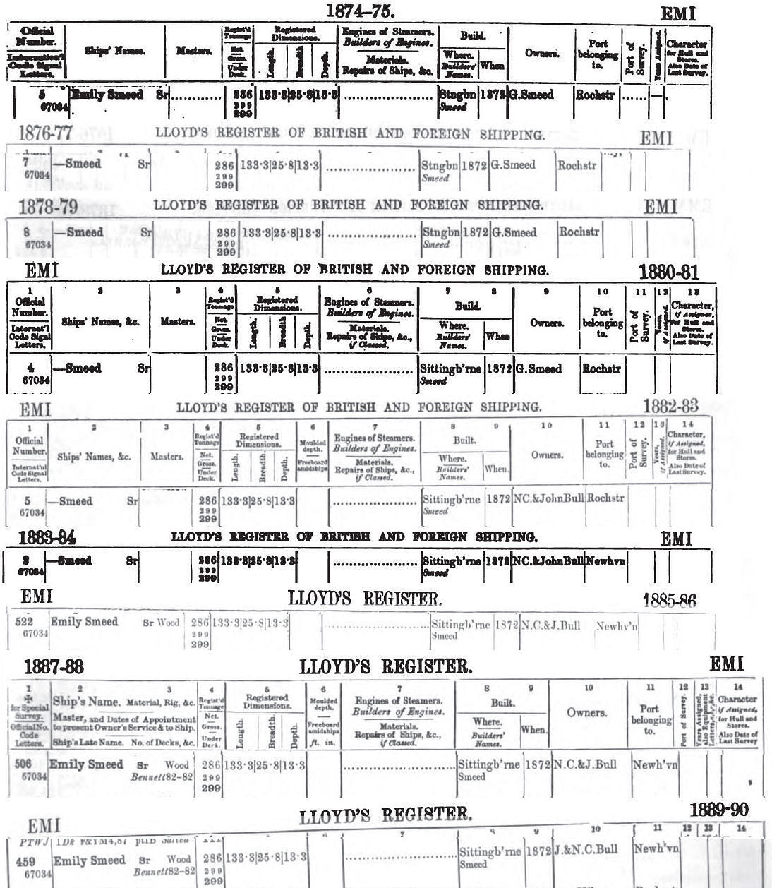 Emily Smeed was built, in 1872, by a ship builder by the name of Smeed, at Murston, Sittingbourne, Kent. A 299 ton wooden schooner, 133.3 ft. long, 3 masts, initially owned by G. Smeed & registered at Rochester, Kent, with a crew of five (at the census in 1881, James Bennett was the Master). ON #67034. The vessel may have been built of recycled timber due to the difficulty of obtaining seasoned timber at the time at an economical cost. Now the webmaster has a number of editions of Lloyd's Register available to him, ex Google Books, thru 1889/90. As you can see here. During that period the vessel was always a schooner, & became, in the 1882/83 edition, owned by J. H. Bull & Company ('Bull'), of Rochester. Soon registered at Newhaven, Sussex. I read that Bull held a contract to deliver coal from NE of England to the Eastbourne Gas Company, presumably at Eastbourne, Sussex, & though they also sailed to the Baltic & to ports on the mainland of Europe, that such coal trade was their principal business.