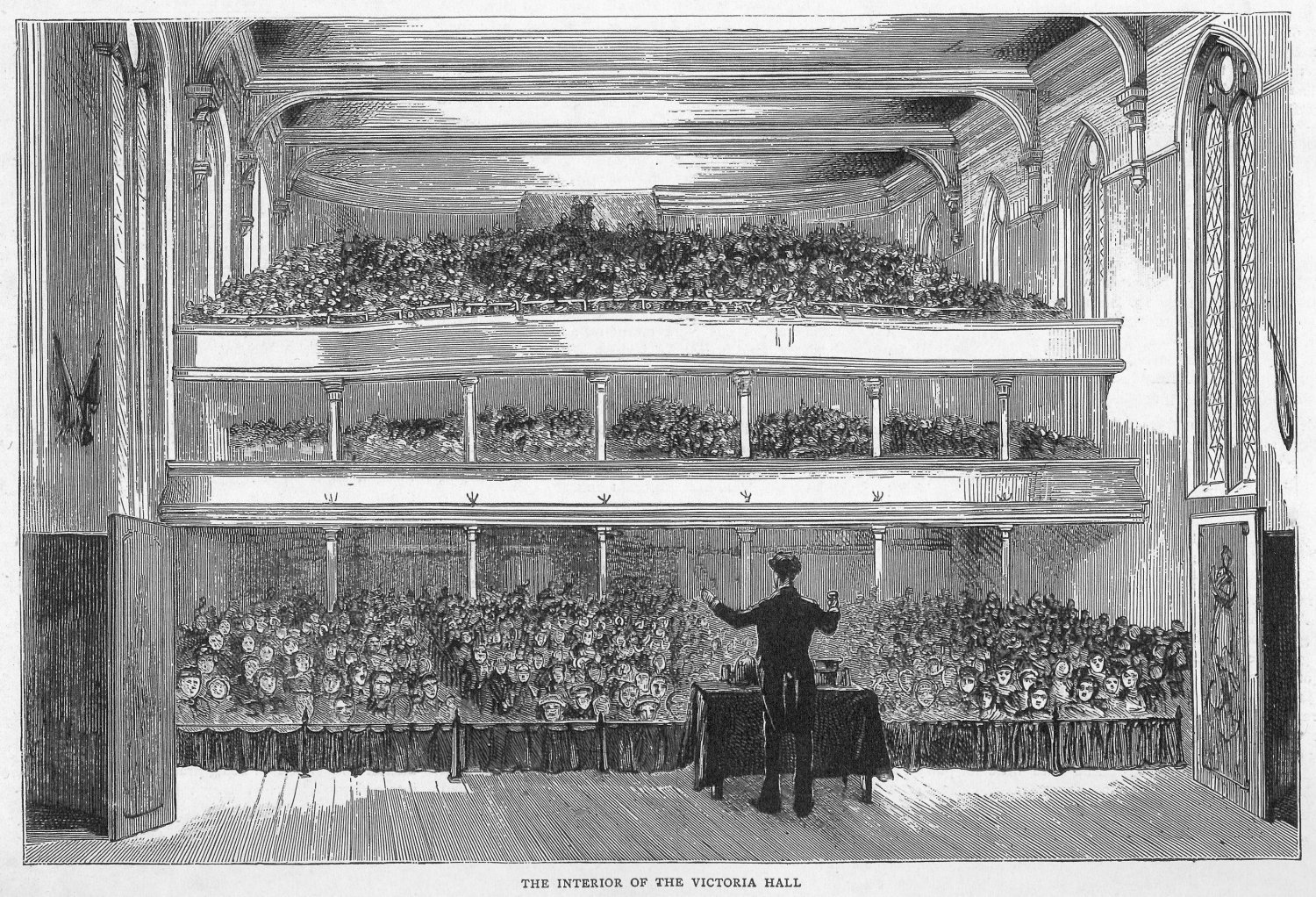 The extensions had left the original hall itself largely unchanged & the terrible tragedy of 1883 continued to blight the new elongated building which, it was bitterly said, was 'shaped like the coffin it once was'. None-the-less, there was soon a continual flow of a very wide range of bookings. including concerts, variety shows, plays, political speeches, religious services & public meetings, many of the latter becoming over-crowded & noisy.