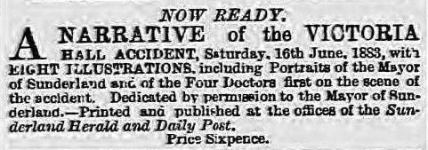 A 67 page booklet, entitled 'Narrative of the Victoria Hall Disaster', was published at Sunderland in 1883 by 'The Sunderland Herald and Daily Post'. The booklet, which contains 8 illustrations, sold at issue for the price of sixpence.