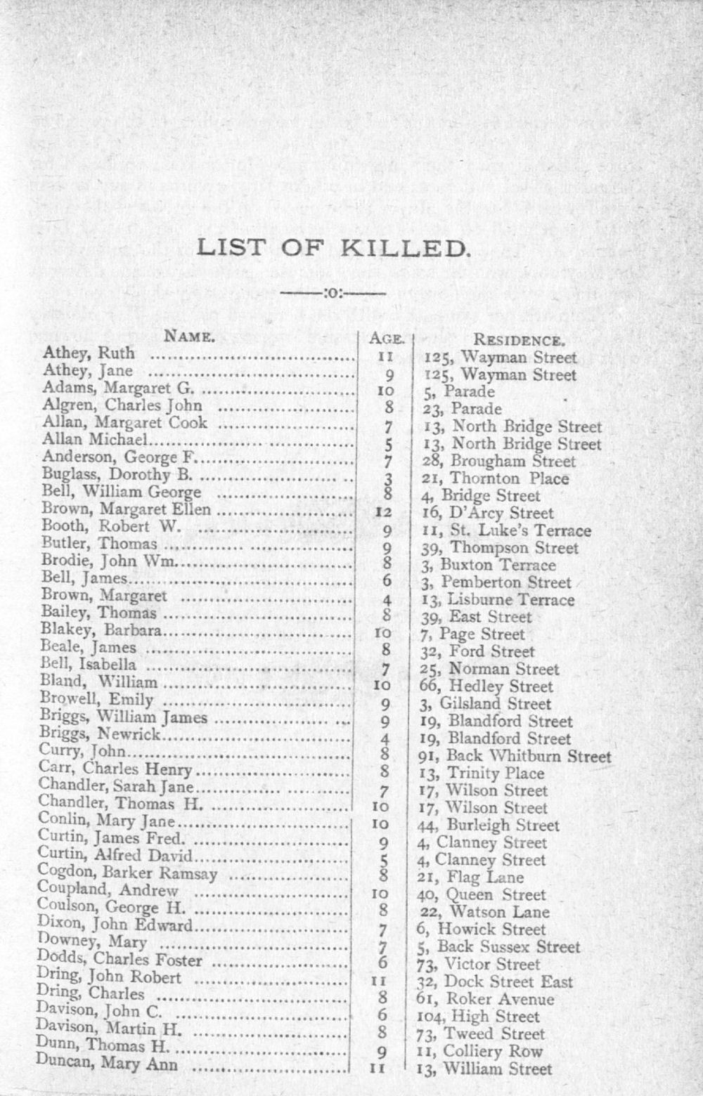 Georgina Coe (walking with the aid of crutches), residing at 6, Wear Street, and 11 years of age, deposed : I go to Nicholson Street School. I got a ticket from the teacher and a penny from my aunt. I was in the top part of the gallery with my companion, Margaret Dodds. I noticed a door on the landing against the wall. Before the entertainment was over Margaret Dodds and I played on the stairs until the man came with the toys, which he carried in a big box. When the crush came I was at the furthest corner inside the door, and stood leaning on my crutches until I was taken out. I did not see any one bolt the door, but saw a man pull it after him as he went out.