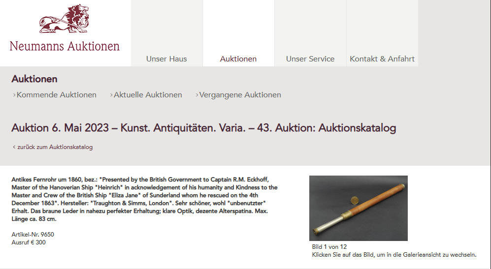 I learn that a peremptory sale is a sale where items are sold 'as is', with no warranty or guarantee of their condition or quality. Or a sale where there is no reserve price set. Which may well mean that Cambridge, even though only 24 years old, was in poor condition, maybe as a result of spending much of her life in tropical waters. Perhaps its condition was so poor that it had to be broken up. Certainly the webmaster has not, so far at least, spotted any later references to the vessel.