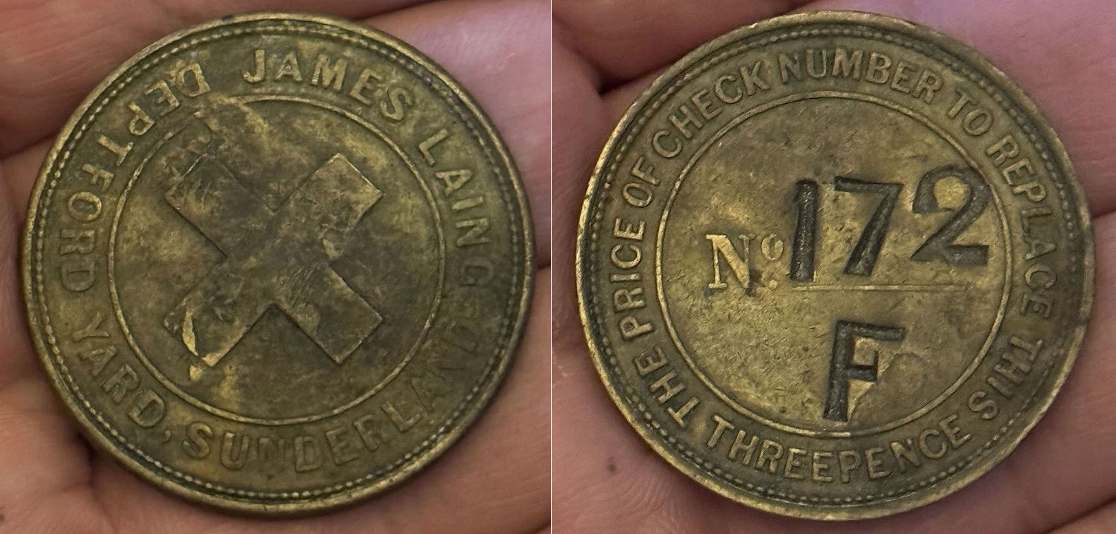 Note:- The token in the second row above was from an expired 2011 e-Bay listing - a 'mudlark' find on the Wear river bank. It dates from the period before Laing's was renamed & incorporated i.e. prior to 1897. We thank vendor 'tallyman' (his store which now would seem to be inactive) for its inclusion here. The fine images of a similar token in the bottom row is from an e-Bay listing in Jan. 2026. As this page is updated on Jan. 11, 2026 the token has just sold for GBP 7.50. You can see the item here. Offered by 'jameslee2388', whose e-Bay store page is here. We sincerely thank James Lee for the use of his listing images. Do drop by his page & view the item.