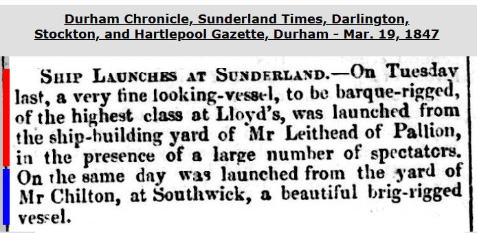 It would seem that 'James Leithead & Co.' had a shipyard at Low Street in Sunderland from 1827 to 1833, in partnership with others in the first two years. In 1834 the yard was moved to North Sands & there was no building in that moving year. But he built ships at North Sands from 1835 thru 1844, & then (1844) at Deptford & (1847) at Pallion - however Corder suspected that the Deptford & Pallion yards were one and the same. It would seem that the shipbuilder name continued with Arrow Leithead & Andrew Leithead together at Pallion in 1850. Then they parted ways. Arrow continuing at Pallion while Andrew went into business at Southwick. There would seem to be no 'Leithead' references after 1857.