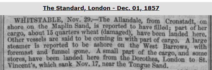 The webmaster has not read anything about the circumstances of the vessel's loss. He learns, however, that the master & surviving crew of Standard ended up aboard Cosmopolite, noted to have been a Newcastle registered barque. One Standard crew member had been lost - drowned, I read. Such info was provided by Lord Canterbury, a barque built at Quebec City in 1835, when it later arrived at Bristol. It had spoken with Cosmopolite off the SW point of Anticosti Island (Gulf of St. Lawrence) on Aug. 21, 1839. LRs of the period do not record a barque named Cosmopolite registered at Newcastle, but one is recorded as registered at Plymouth, a 373 ton barque built in New Brunswick, Canada, in 1833. I cannot tell you where the Standard crew members were landed nor how they were later repatriated. A couple of contemporary news reports re Standard's loss - (1 & 2).