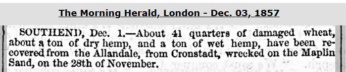 There do not seem to many operational references re Ariadne. But the webmaster notes that in early Aug. 1865, Captain Norman, then at the Downs, reported that on Jul. 28, 1865, southbound from Shields, Ariadne had been run into by an unidentified brig when off Hasbro' (Hasborough Sands, located near Cromer, Norfolk). Further that Ariadne had been significantly damaged, indeed had been cut down to the water's edge. This news report relates.