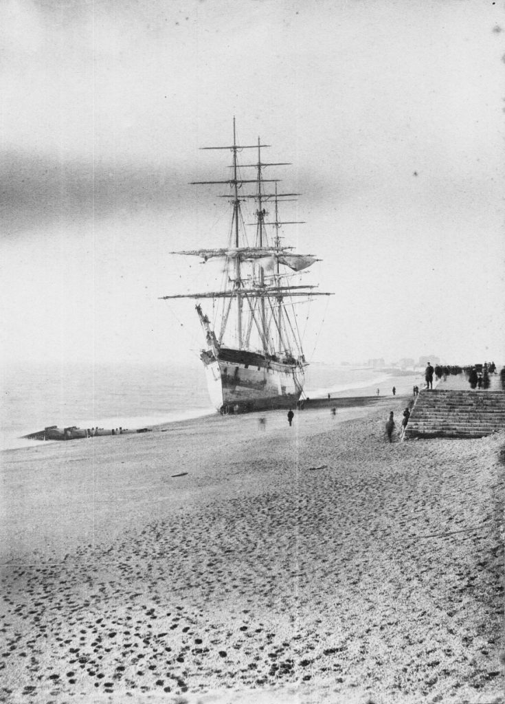 The vessel proceeded up the Channel in thick & hazy conditions & went close to the coast near the Dungeness Light & into shallow waters hoping to be able to take on a pilot. Excessively close to the coast it would seem, especially in the then gale conditions. Between 5 & 6 p.m. on Jan. 29, 1883, the vessel struck the sands aft, in a position held by the vessel's port anchor. At a point on the Kentish coast between the coastguard stations of Sandgate & Hythe. (I have seen a couple of references to it rather coming ashore at Seabrook). At 8 a.m. the next morning, the Sandgate coastguard arrived with a rocket & breeches buoy apparatus & landing the passengers & crew commenced. Interrupted when the anchor gave way & Plassey ended up broadside to the sea, her bow to the east. The rocket rescue continued & everyone aboard was safely landed. I should note that Lady Vita, a Dover Harbour Commissioners steam tug, arrived on the scene, & got a line aboard Plassey. However, John Kelly ordered the line to be let go, believing the tug to be insufficiently powered to pull his ship off.