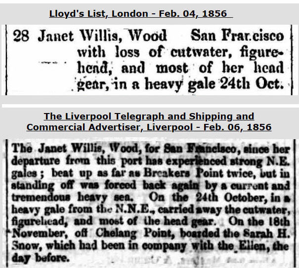 The 'Harrison' ownership was surely as a result of the vessel again being offered for sale at an auction held on May 19, 1853 in Lloyd's Captain's Room, London. The vessel was then lying in St. Katharine Docks, London. One of the advertisements.