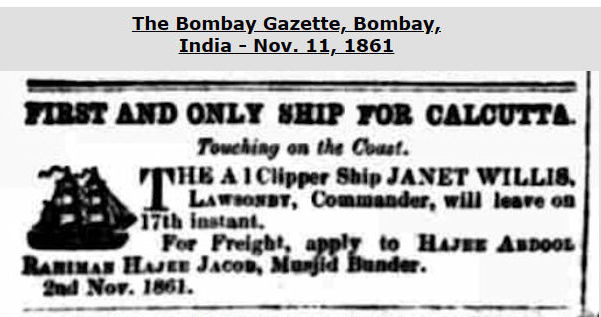 It was, per LR, owned by Smirke & Co. of Sunderland, from 1851/52 thru 1855/56, for consistent service from Sunderland to Calcutta (now Kolkata), India. With W. Jackson serving as the vessel's captain. A Sunderland shipping website, which website requests no links or recognition, advises that the vessel was first registered at Sunderland on Oct. 31, 1850, owned by Nicholas Smirk Snr. & Nicholas Smirk Jnr. (both with no 'e' at the end).