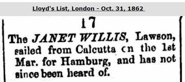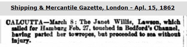 The LR data in 1853/54 is modest. Which suggests that the ownership was changing again. LRs of 1854/55 thru 1856/57 all record T. Harrison of London as the vessel's new owner. For service from London to Calcutta (now Kolkata), India, in 1854/55. And modest data in 1855/56 & 1856/57 with no service data. No captain's name is recorded after 1853/54.