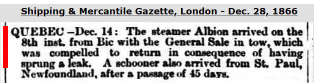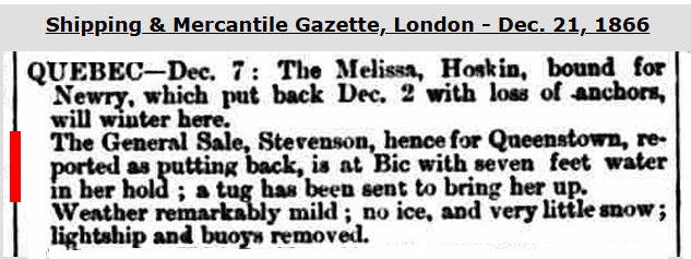 I first learn that on Nov. 24, 1866, General Sale, with 'Stevenson' in command, was cleared out of Quebec for Queenstown, Ireland. It soon became very leaky, & put into Bic (S. shore of the St. Lawrence river, SW of Rimouski) on Dec. 07, 1866 with seven feet of water in her holds. A tug was sent to 'bring her up' & on Dec. 08, 1866 she arrived back at Quebec under the tow of Albion, a steamship, presumably a tug. Per these contemporary newspaper reports - 1, 2 & 3.
