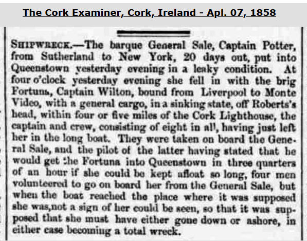 On Apl. 06, 1858, General Sale, en route from Sunderland to New York under the command of Captain Henry Potter, put into Queenstown in a leaky condition. Leaky due to having encountered massive storms which were widespread throughout the U.K. and particularly violent in the Irish Sea. She had on board Captain W. J. Willerton & seven crew members of Fortuna, picked up on Apl. 05, 1858. Fortuna, a brig, had been en route with coal & a general cargo from Liverpool to Monte Video, Uruguay. Willerton had had to abandon his ship in a sinking condition when near to Queenstown & had taken to their ship's long boat. Four General Sale crew members went to the spot where Fortuna was last seen but she was nowhere to be found. Per these contemporary news reports - 1 & 2.