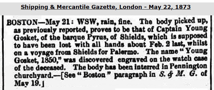 I learn that 'Goodson' was the vessel's captain thru late Jul. 1876 at least - he died in a London hospital on Nov. 11, 1876 at the age of 44.