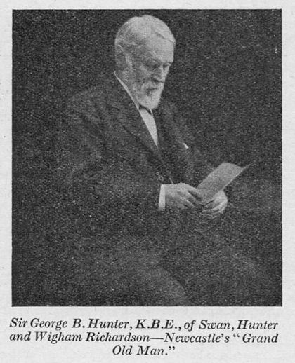 Many other great ships have come, and will continue to come, from the Tyne. Sir George Hunter, knighted for his services to the country in 1918, retired from the Chairmanship of the great firm he created when he reached his eighty-third year, in 1918. He still lives in Newcastle-on-Tyne, happy to be almost within sight of the sea, and so close to the scenes of his early labours and his later great achievements.Webmaster's note:- From 1912 to 1933, 'Swan Hunter' operated a yard on the River Wear at Southwick. It commenced building ships there in 1917 & in 1919 at least had three building berths. Detailed listings are available on site page 83 re 20 of the vessels that they built at Sunderland. I list also on that page the names & hull numbers of 29 other vessels that 'Swan Hunter' built there. The exact number of ships that they built at Sunderland is, however, a little confused & the list needs correction.