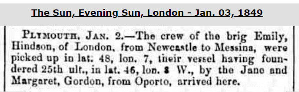The vessel was first listed as a result of the webmaster having read that on Dec. 25, 1848, at 46N/8W in the outer Bay of Biscay, Emily, built at Sunderland in 1832, foundered at sea. Emily's crew were picked up by Jane & Margaret, 'Gordon' in command, ex Oporto, Portugal, & landed at Plymouth. Per this contemporary news report.