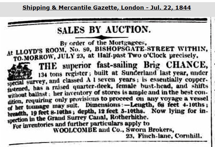 Was completed in May 1840 & initially owned by Headley of Newcastle for service from London to Mauritius, with 'Ansell' her captain. The webmaster has not researched this vessel. He notes however that Lloyd's Register of 1869/70 indicates that the vessel had been 'Wrecked'. Then owned by W. Davison of Shields with J. Lander her captain. For service from Shields to London. 93.0 ft long.
