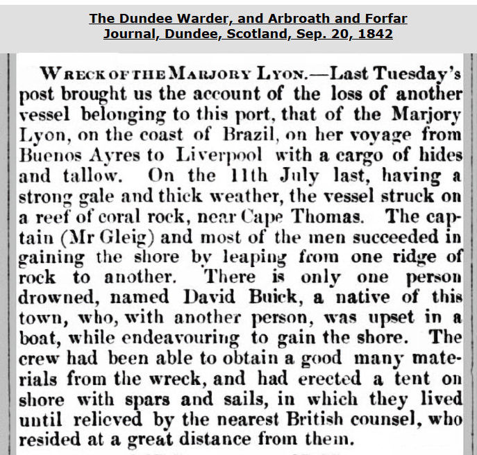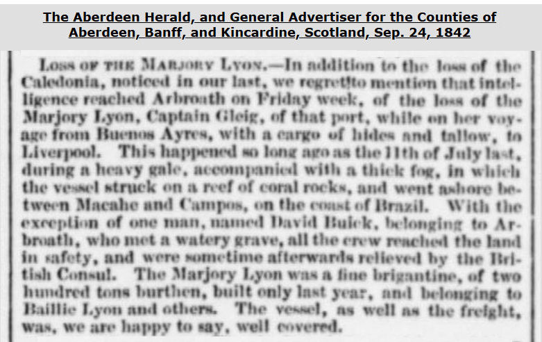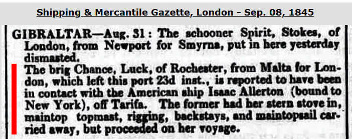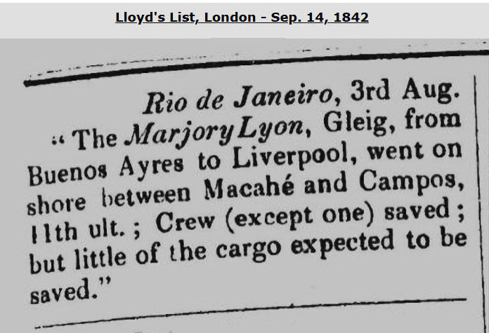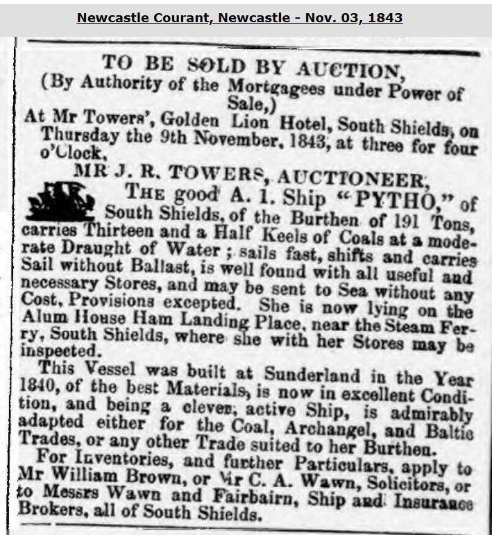 A vessel, always owned by Panton & Co. of Sunderland, which had a very short life. Wrecked in Pentland Firth, Scotland, on Mar. 16, 1846. Her entire crew of 12 were lost & it would seem some passengers also.