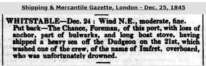 It was reported (in green) from Elsinore, Denmark, on Nov. 20, 1849, that a Sunderland registered vessel of the name, en route from St. Petersburg, Russia, to Liverpool, had gone aground on Heligoland (German islands in the North Sea, located 43 miles off the mouth of the river Elbe). And that after she had discharged 45 casks of tallow, she had got off & would continue her voyage. Was it 'our' vessel? It could well have been. While 'Cloak' is noted to have been her captain at the time, 'Cloak' & 'Clarke' are somewhat similarly sounding names.