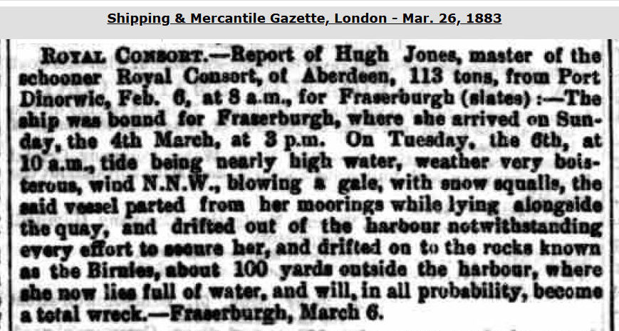 The webmaster has not researched this vessel. He lists it having spotted that Lloyd's Register of 1878/79 notes that the vessel, then owned by J. Skerry of Whitby, had 'Stranded'. The Mercantile Navy List of 1870 tells us that the vessel, then Whitby registered, was owned by James Baxter of Robin Hood's Bay, Yorkshire. Signal letters NTDF.