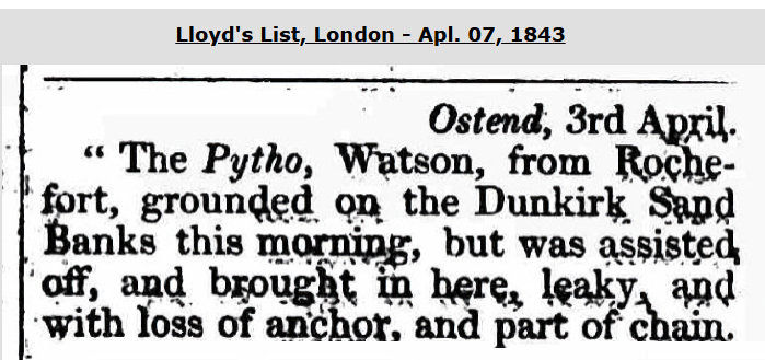 This vessel is Lloyd's Register listed thru 1863/64, incorrectly it would seem. Many voyages to Australia. On Apl. 27, 1857, en route from Hong Kong, the vessel struck on Cape Dombey, Guichen Bay (SSE of Adelaide, S. Australia). Beached to save the passengers, the vessel became a total wreck.