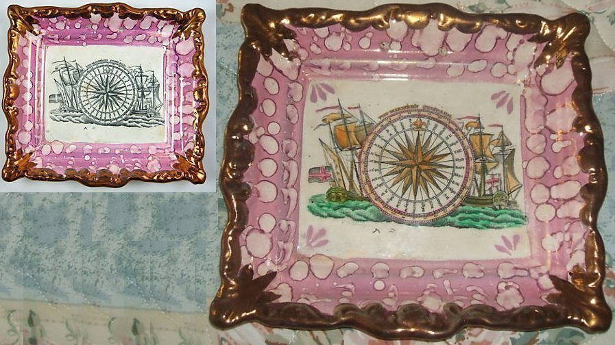 Rather the term is applied to more modern techniques where the iridescence is produced by applying a film on top of a glaze, by hand painting or perhaps by dipping, the decorative design being formed from metals, a different metal, such as copper, gold or platinum with other metals also such as tin, according to the intended colour of the finished piece. Those techniques came into usage in England in the very early years of the 19th century.Now 'Sunderland lustreware' so often features images of places, ships, people & verses, and I understand that such images were applied by means of a transfer. Which perhaps is not lustreing? So a lustre piece would so often incorporate transfer printing as well. Transfer printing is a confusion to me. I read that the designs were created on copper plates, which plates often became owned by other potteries when a pottery failed, moved or was purchased. So the identical transfer design might appear upon pieces produced by different potteries. But by what process an image on a copper plate was transferred to the face of a piece of pottery, I could not for a long while, explain.