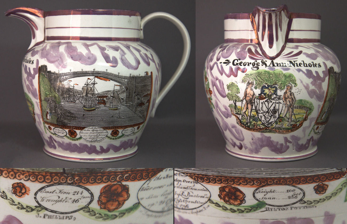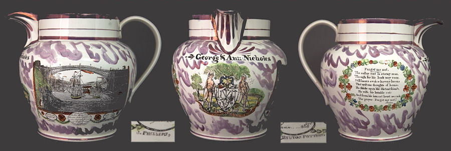 I am advised that there are few pieces of pottery that can be specifically attributed to the North Hylton pottery either from the Mailing period thru 1815/1817 or the continued period after then. It was continued by John Phillips or apparently by his son, & was in business certainly thru 1841. By 1851 it was gone, as above.Keith Cockerill advises (thanks!) that marked pottery pieces for the North Hylton Pottery in its Maling-owned days (1762-1815) are said to be incredibly rare. There are, however, two unmarked North Hylton Pottery pieces from the Maling period on display in the Sunderland Museum. Re the 'Phillips' period, i.e. after 1815, Keith advises that the Sunderland Pottery book (1984) says that 'John Phillips - Hylton Pottery marks are said to occur but as yet, no examples have been identified'. While that may well still be true, a fine example of a 8 1/8 in. tall pink lustre jug, with no pottery mark, but marked 'J. Phillips' & 'Hylton Pottery' and 'George & Ann Nicholes', is available by e-Bay as this page is updated in Oct. 2014. Do drop by e-Bay to view the many fine listing images provided by 'cairngorms-fineart' of U.S.A. Since the piece would seem to be both rare and splendid, composite images of the item follow, available also in a larger size by a click of your mouse. The listing references a similar jug, signed by J. Phillips, Hylton Pottery with the South East View (of the bridge) is in the collection of the Victoria & Albert Museum in London, museum number 3662-1901.