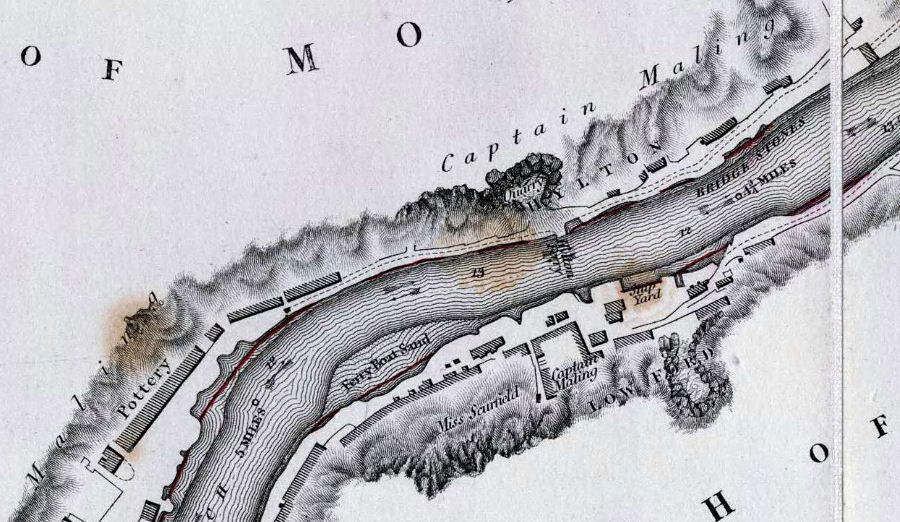 But now, I believe it is clear that the oven visible in those prints, is not of a pottery at all & from the data I have read cannot be Burnside's Pottery. It would seem that there were no potteries on the south bank both east & west of the road bridge.