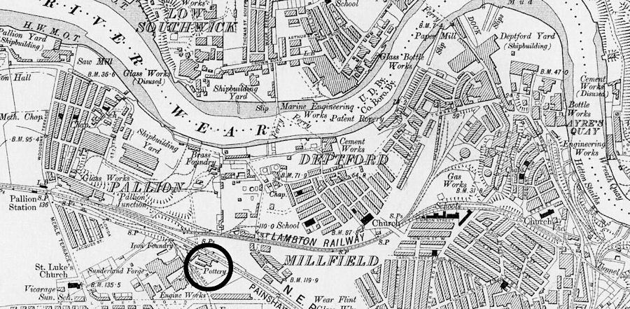 But where exactly was the pottery? 'Sunderland Pottery' provides a modest map, which does show Burnside's Pottery located west of the iron bridge and south of the River Wear. But it also indicates that the pottery was located 'on Pemberton's Field, situated on the south side of the River Wear near the north end of Green Street, Sunderland'. How very interesting! The webmaster, who may well prove to be quite wrong in his conclusion, has difficulty in describing the steeply sloped land that runs down to the River Wear from the table land above as being a 'field', which term might better describe more level ground. And Green Street? It ran roughly parallel to the road bridge about 300 ft to the west of it. And ended at Matlock Street which roughly paralleled the river. Or at least in 1895, it did. I conclude that Burnside's Pottery was most probably located on the table land above the River Wear. To the west of the road bridge indeed but not right at the river bank.