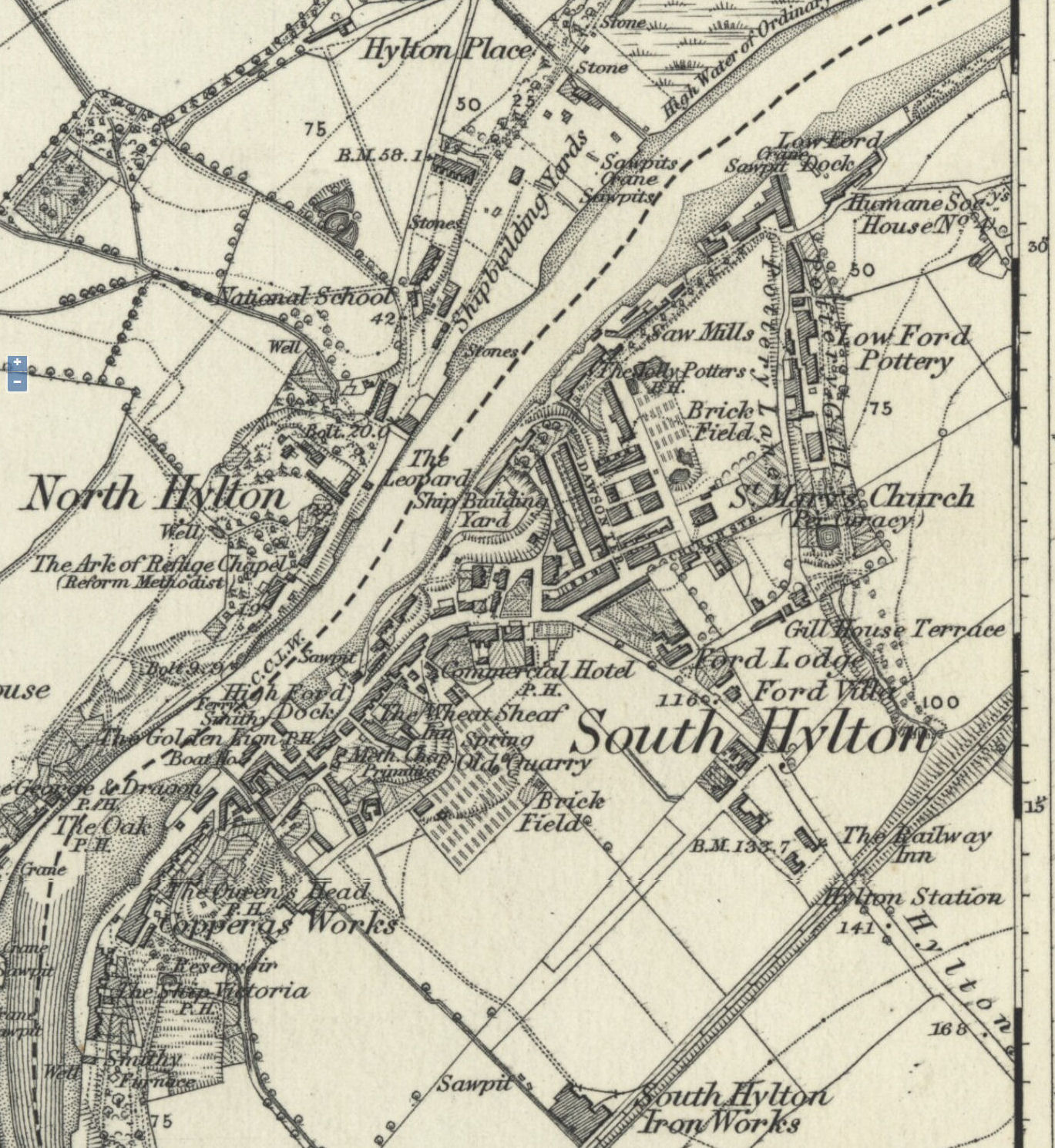 (OF SOUTH HYLTON)It would seem that there was a pottery at what would now be termed 'South Hylton' from the late 1790s (the bottom of this page (link no longer works) says 1794, Michael Gibson believes it started at about 1790 & this page says 1798. Just reporting what I read!) to 1864. But 'South Hylton' is a comparatively recent place name & up until the late 18th or early 19th century it would rather have been known as 'Low Ford' or 'Hylton Ferry'. Hence the name 'Low Ford' in the name. Can anybody tell us exactly where it was?