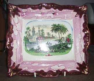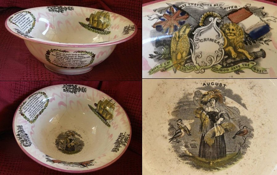 A most beautiful lustre bowl, measuring 12 1/2 inches across the rim & 4 1/2 inches high. With a repeated 'Crimea' motif & also an 'August' motif. The site visitor who kindly provided these images, advises that the bowl is believed to have been a wedding gift for her GG grandmother, who was married at Blean, Kent, on Aug. 30, 1857. The Crimean War was in the period of Oct. 1853 to Feb. 1856. The bowl also has an iron bridge transfer on it (not visible below), and a repeated verse that can be seen here. Made by 'Scotts' from the mark on its base.