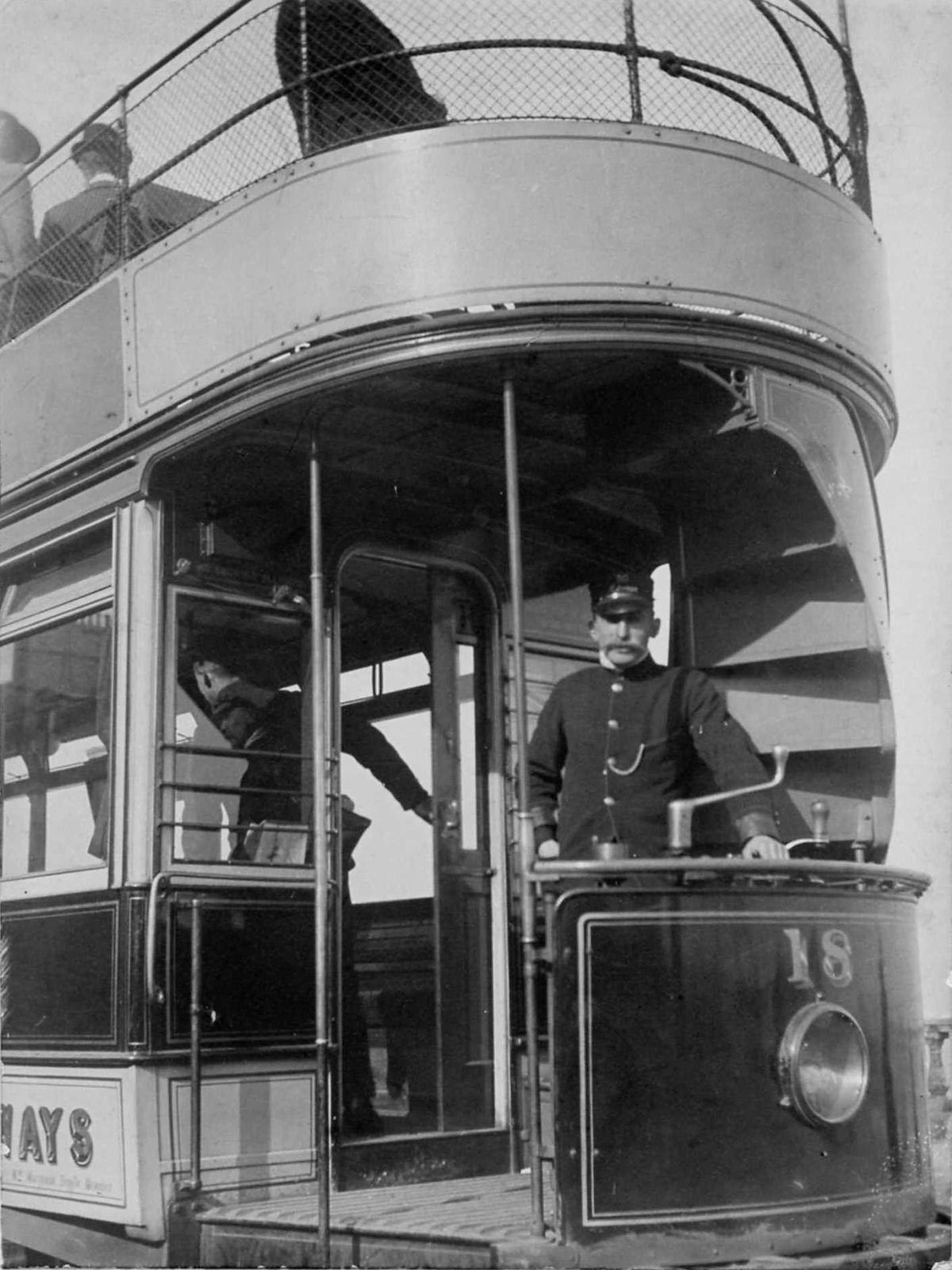 9) The next image, of car #18, has an interesting story to tell. Malcolm Fraser advises that it was one of six cars (13-18) delivered by Dec. 1900. These cars were equipped with 'bogies' mounted at both ends near the platforms rather than a single large 'truck' like that of car #7 above. These 'bogie' equipped cars were not a success, however. They could not cope with the sharp curves on the system & constantly derailed as a result. So they saw very little service until the spring of 1901 when the bogies were replaced with a single four-wheel 'truck'. In the 110 years since that time, no-one has identified a picture of one of these cars in original form - until now! Check out the tie-bars & leaf springs next to the platform of car #7 & note that they are not present on car #18, which therefore still has the bogies. Taken on Roker Terrace around Mar. 1901, this image is a real rarity. The pill-box hat worn by the driver is not often seen either, as they apparently went out of use in Sunderland in about 1905.