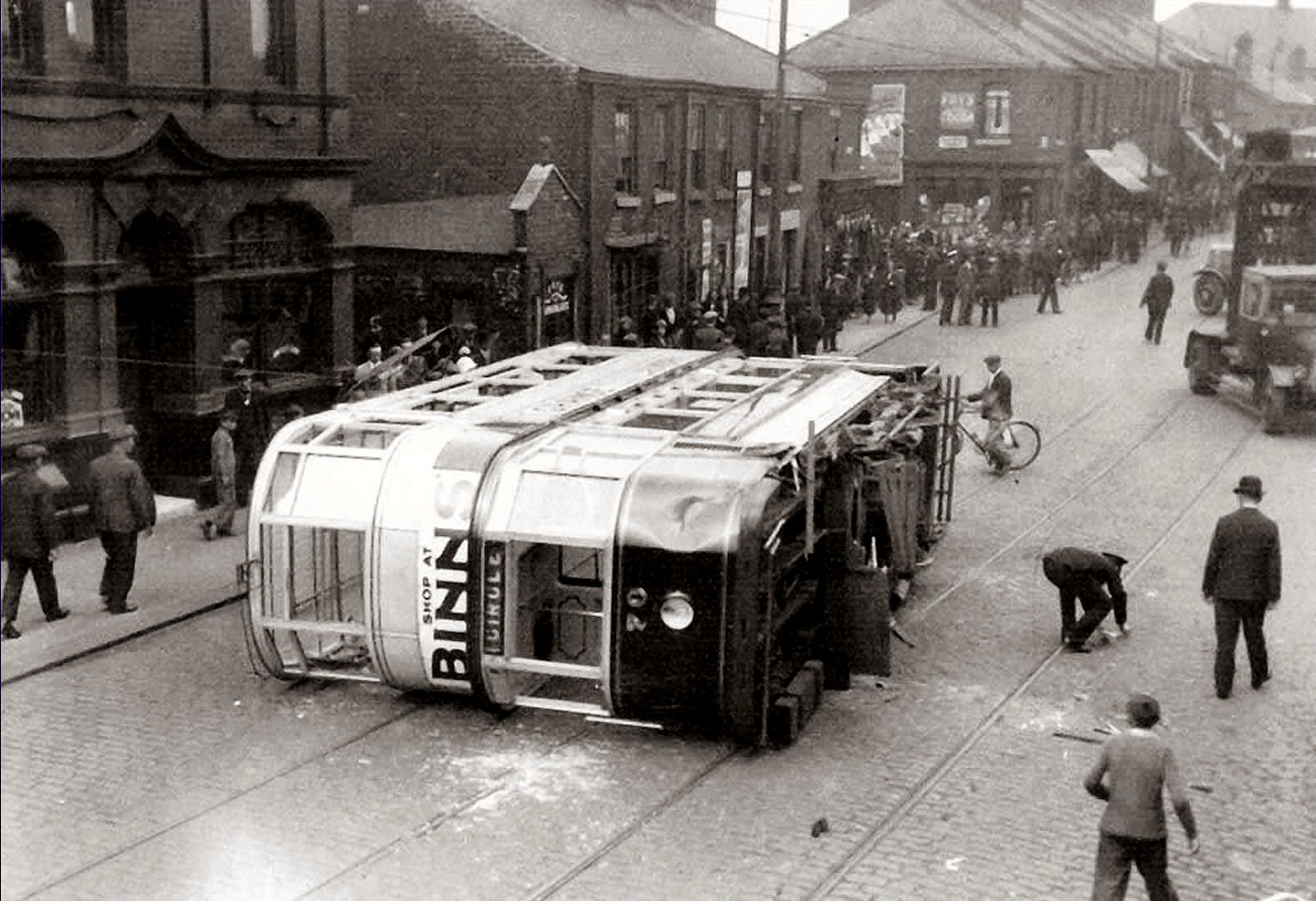 13) Tram No. 70, on it side in Hylton Road, Sunderland, on Jun. 15, 1933. I found the fine image on 'Sunderland in Pictures' on Facebook. The Facebook site is long gone, alas, but you can see the posting here. You can read more about the accident here, where Malcolm Fraser indicates that the image is '© Allan Edwards'. A collision had apparently taken place between the tram & a brewer's lorry - at Kayll Road, opposite Ailesbury Street. The 'Mountain Daisy' pub, I read, is in the background of the image, likely on the corner. 13 persons were injured, fortunately none of them seriously. No word as to whether any beer was spilled!