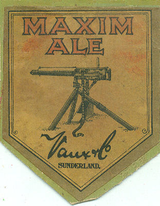 Upon the safe return of Ernest Vaux to Sunderland, the brewery, in 1901 or 1902, created a new ale, 'Maxim Ale' with a most distinguished looking label depicting the Maxim Gun. Apparently the brewery received complaints from pub landlords who said that the new ale was so strong that it put their customers to sleep! Not good for custom, I presume. So the strength was reduced - to be increased many years later in 1938 with the beer renamed 'Double Maxim'.