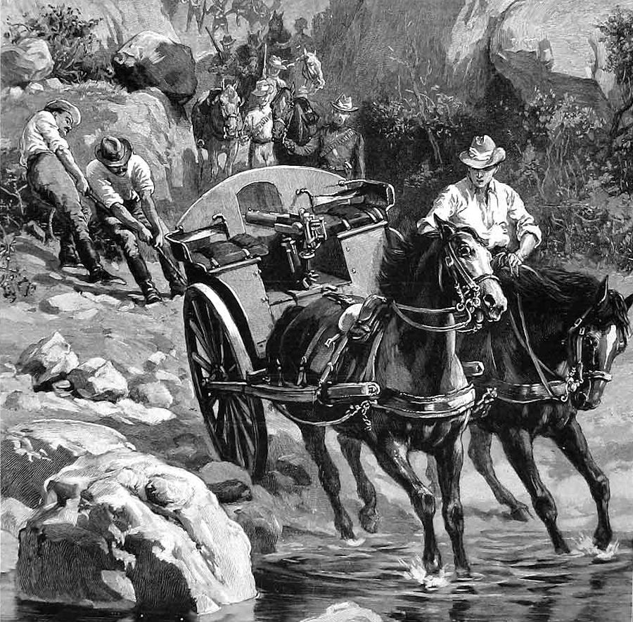 Now the label depicts the Maxim Gun indeed. I suspect however that the Maxim Gun used by Ernest Vaux during the 2nd Boer War would likely have been carriage mounted & towed by a team of strong horses, as shown in the fine next images.