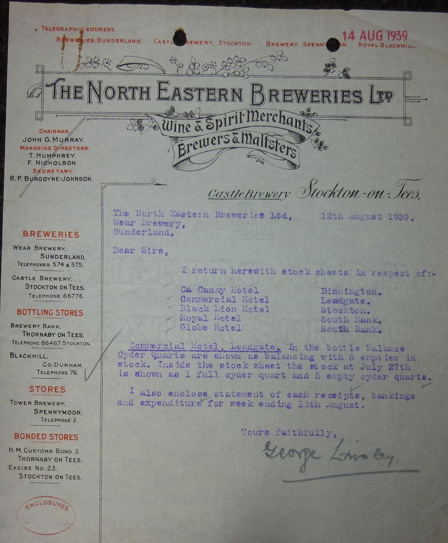 2) The main entrance to Vaux offices was about 100 yards into Gill Bridge Avenue off High Street West at the Londonderry corner. The stables & brewery extended behind the office buildings towards the staiths. It was a big area now completely demolished for development.THE NORTH EASTERN BREWERIES LTD.
