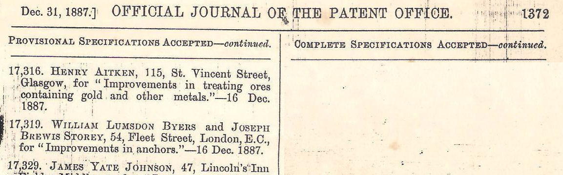 Lesley Duff's family tradition is that Joseph Storey invented the stockless anchor. Hopefully, in the future, new data will emerge to expand upon that family tradition. However what is now known is that a patent was applied for - on Dec. 16, 1887 - for what became the 'Byers stockless anchor'. The names of both William Lumsden Byers ('Byers') and Joseph Brewis Storey ('Storey') were apparently both on that application. It would be useful to know what Byers did for a living at that time. (but now see here) Does anybody know more? Storey was not a wealthy man of course, & was not in any position, on his own, to protect the stockless design & to commercialise it.