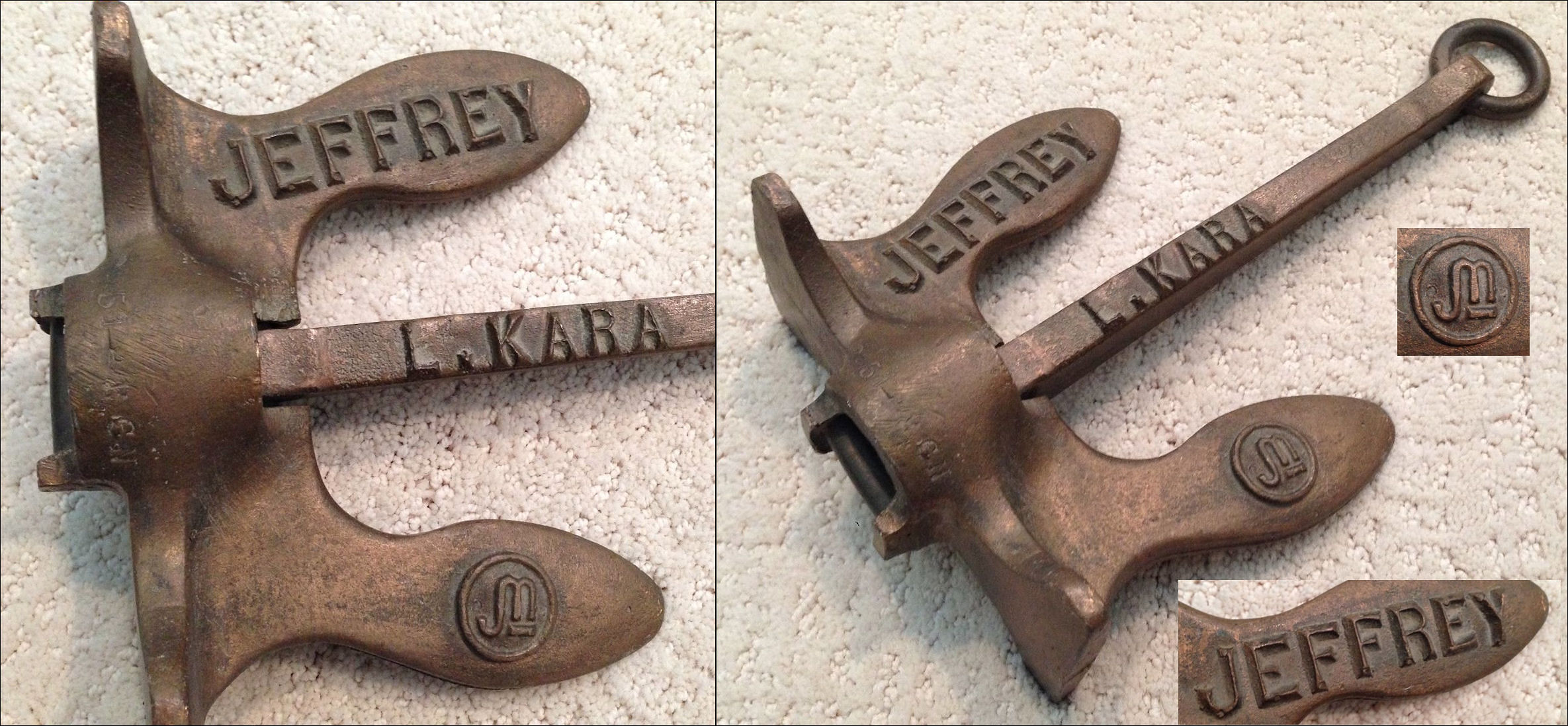 1) Not related to W. L. Byers & Co. Ltd., but included here since the item may well be of interest to site visitors. On Jun. 24, 2014, a miniature anchor, marked 'JEFFREY' & 'L. KARA' was sold via e-Bay. For U.S. $15.00. Described by the vendor as a 'beautiful small antique anchor, marked on the flukes with both "JEFFREY" and a foundry mark. The shank has "L. KARA" marked on it. Weight: 4 lbs Height: 10 3/4 in. Width: 6 3/4 in.' A good looking miniature anchor indeed. Can anybody tell us more about it? Was Jeffery the name of the anchor manufacturer perhaps? If you can help any, possibly by identifying the 'jm' foundry mark, do consider being in touch with the webmaster. A composite of the seven listing images follows - a larger image is available by clicking the image.