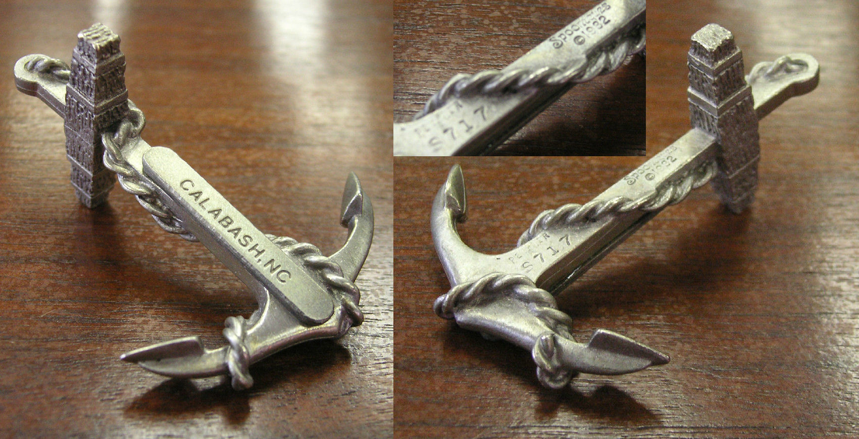 Hylton Butterfield, a site visitor, has kindly been in touch & refers me to a reference (1 & 2) to an Ohio, U.S.A., company that may possibly relate. And it does relate - read on! The page advises as follows:- Another major player in Ohio’s labor history is the Jeffrey Manufacturing Company, headquartered in Columbus. Begun in 1887 when Joseph Jeffrey bought out his partners in the Lechner Mining Machine Co., Jeffrey manufactured mining machinery and other large-scale industrial equipment. Much of the equipment they produced–things like conveyors, drilling machines, bucket elevators, mine fans and coal cars–was used by other major Ohio industries, particularly coal mining in the southern part of the state. An extensive history of Jeffrey Manufacturing Company can be read here. While I could not spot any references in that document to anchors or to the name of Kara, an image on page 13 of the 'pdf' shows a piece of machinery with clearly the identical 'jm' mark upon it. Thanks so much, Hylton!2) On Jan. 20, 2015, another miniature anchor - a truly miniature anchor in pewter, was sold via e-Bay. The listing is long gone. Described as being '1982 Miniature 2 3/4" Spoontiques #S717 Pewter Anchor Calabash NC' - 2 in. by 2 5/8 in. in size & 2 oz. in weight. It sold for U.S. $10.00. A pretty item indeed. A composite image follows - a larger image is available by clicking the image.