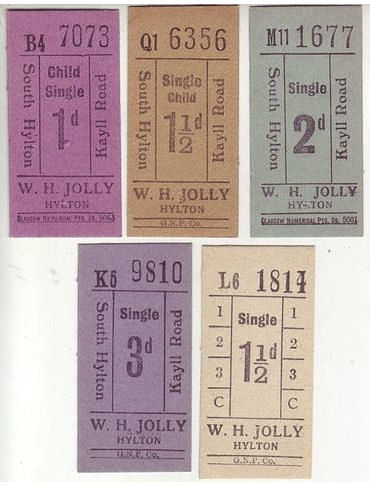 And some more 'W. H. Jolly' of Hylton bus tickets, these printed by 'Glasgow Numerical Printing Co.' Again of unknown date. An e-Bay item in Feb. 2019, sold for GBP 2.25. Described as 'Pre-Decimal'. A larger image of the fronts of the tickets can be seen here.