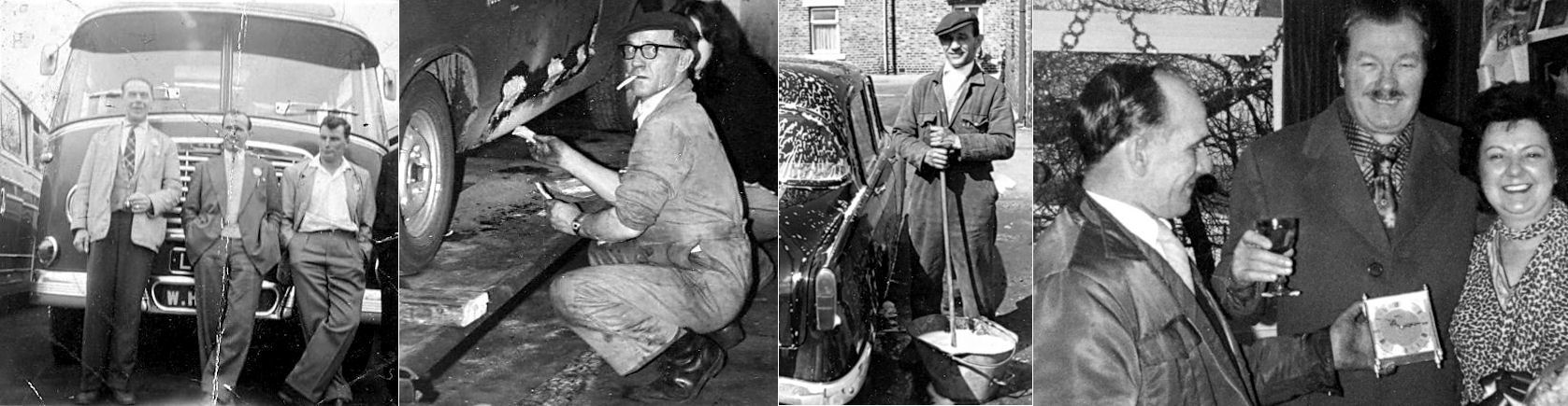 Cliff advises me that the South Hylton Medical Centre is today where the W. H. Jolly garage used to be. Cliff Lofthouse Senior, Cliff's father, was a long-term employee at the firm & was both a coach driver & a mechanic. In the image at right below he is receiving a clock from Ken Jolly (looking at camera) at Cliff's retirement party - the lady at right is, we believe Ken's wife Nolda Jolly. Cliff is in the middle in the image at left with Arthur Swaine to his left. A larger version of the image below is available with a click of your mouse.