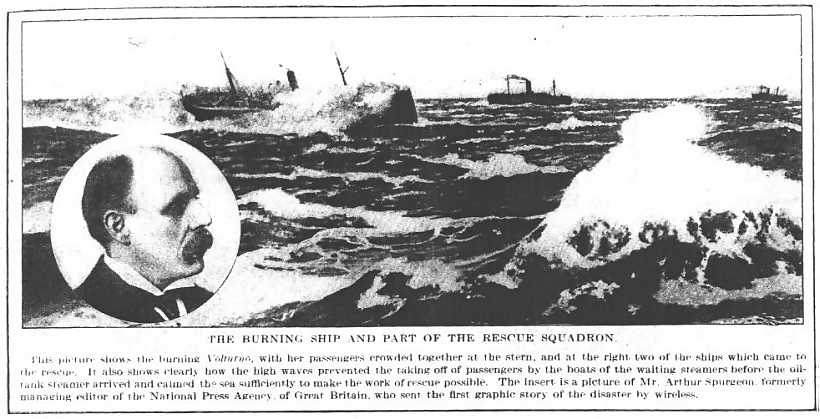According to the wireless dispatch sent by Capt. Francis Inch of the Volturno to the company's headquarters in New York, fire was discovered in a forward hold at 6.55 A.M. on Thursday, October 9. The flames rapidly gained despite the strenuous efforts made to extinguish them. A wireless call for help was sent out. Several life-boats were lowered, but all were smashed by the heavy seas, except two, which were probably lost with their occupants. At 11 A.M. the Carmania arrived, and during the afternoon the other ships which had heard the wireless call made their appearance. The fire on the Volturno was steadily tho slowly gaining. Efforts made by the other ships to take passengers from the Volturno failed because of the gale and high seas. During the evening passengers were induced to jump and they were saved by the boats from the rescuing squadron. Early in the morning, the wind having abated and the waters being further smoothed by oil from the Narragansett, the remaining passengers, who had been huddled in the stern all night, were easily taken on board boats and carried to various ships. According to figures still subject to correction, 532 persons, of a total ship's company of 657, were saved by the Carmania, Grosser Kurfürst, La Touraine, Asian, Narragansett, Seydlitz, Minneapolis, Devonian, Czar, and Rappahannock. One who saw the rescue noted that: